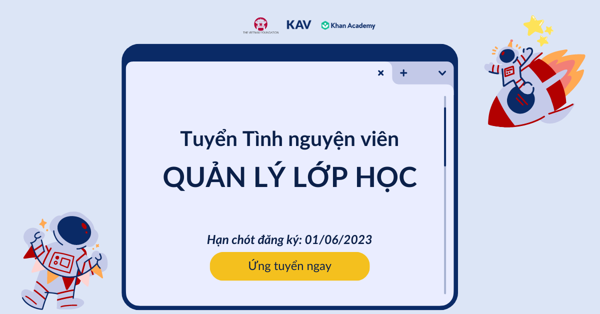 VNF đang tìm kiếm các ứng viên vị trí Tình nguyện viên Quản lý lớp học cho chương trình Khan Academy Vietnam, những người có tâm huyết với giáo dục, cùng chia sẻ tầm nhìn và sứ mệnh mang lại cơ hội học tập bình đẳng tới cho tất cả học sinh Việt Nam.